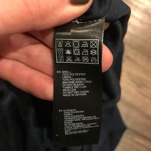 Long dark blue skirt with a slit on both sides. See trough material but has an extra solid piece under that is shorter.