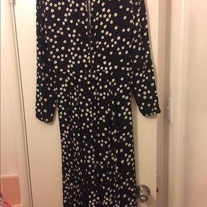 No pants required. Don't say we never did anything for you. This is a midi length dress with a high neck, a side slit, and a two button closure at the back.