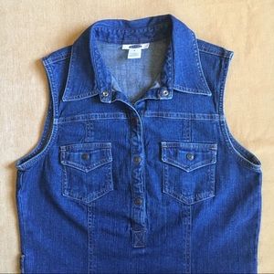 Super cute mid-length sleeveless denim dress. Fits true to size and is in great condition—no tears, no holes, no stains. Great for the summer and fall seasons!