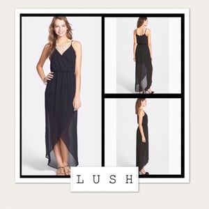 A charming wrap-look front forms the surplice bodice and tulip hem. Long on the outside, above knee on the inside lining.