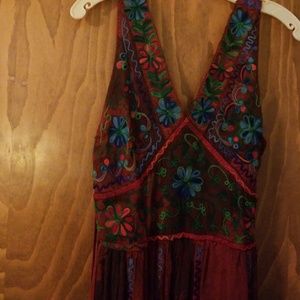 Highly embroidered to ties in the bath stretchy at bust says one size will go up to about a size 14