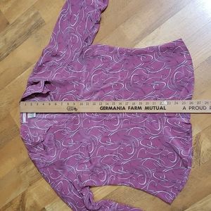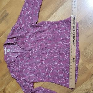 EUC. Gorgeous pink color and luxurious softness. This lovely button down looks great with slacks or jeans. Unique button cuffs add flare to this fun top. Pink, white, & black. Matching tiny pink buttons.