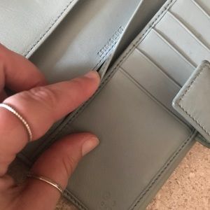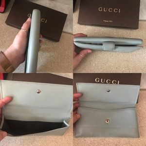 Authentic Gucci Studded Soho Continental Wallet. In hard to find pale blue calksin leather with silver hardware. GG Monogrammed front with stud detailing and contrast dark brown/ black piping. Continental style, front&back snap closure, opens to multiple card slots&full length pockets. In excellent preowned condition. Exterior has mild signs of wear, corner wear, wear to the hardware&some spots on the interior. Mild wrinkling/leather aging. See photos for current condition. Comes w’original box.