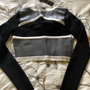 Brand new with tags form fitting skirt set with crop jacket!!! Pictures don’t do this outfit justice! Black and white. Bandage. Never worn. Size Medium.