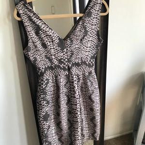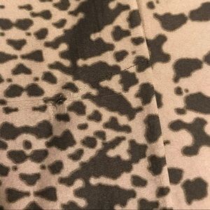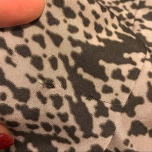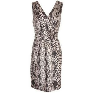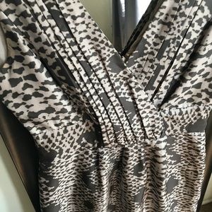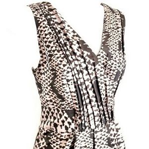 Short dress. 100% silk shell, 100% polyester lining. Size 0P. Animal Print. Very feminine. Slightly used. Light brown and dark brown color. It has a small flaw by the back slit. Please see picture.