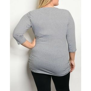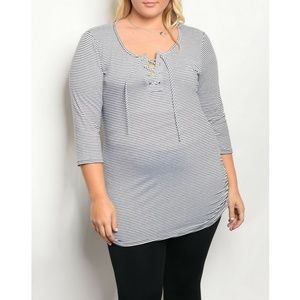 Plus size striped 3/4 sleeve fitted tunic with a lace-up scoop neckline.