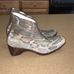 Canvas snake skin printed Ankle Boots. Stretchable nylon canvas material. Round tie edges. . Pull up tabs on the back. Small wedge 2’ heels. Brand new cute & comfy.
