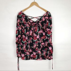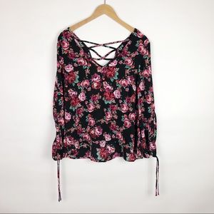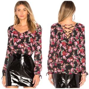 Gorgeous and perfect for fall Jack By BB Dakota Adorlee Top! Features all over floral print and criss-cross back. Elastic wrists with ties and keyhole. Hi-lo hem. Style #JH404780, sold at Revolve. Brand new with tags!