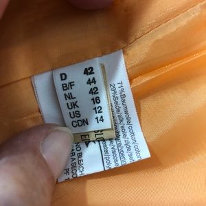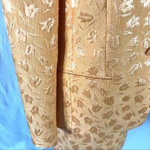 Excellent condition. Tapered jacket with padded shoulders, mandarin collar, 2 front pockets, 3 button closure. Gorgeous tulip print. Both pieces fully lined. About 19” from armpit to armpit, sleeves about 24.5”, about 25” long. Pencil skirt with back zipper and top button closure. There is an added extra button sewn next to original button. 2” back vent. Waist about 30”, hips about 38”, about 22” long. Size 12. Made in Slovenia. 71% cotton, 29% silk. Dry Clean Only M160