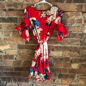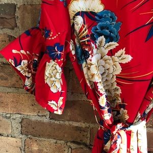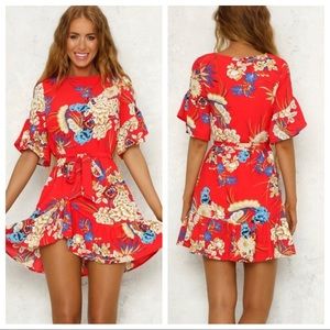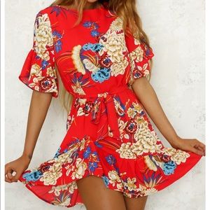 This style has a curved neckline, short fluted sleeves and it has belt loops and comes with a complimentary matching belt. It also has a ruffle on the hem. We love dressing this style down by pairing it with black mules and a gold choker.