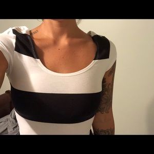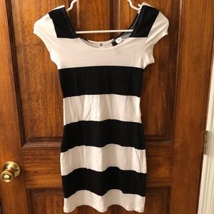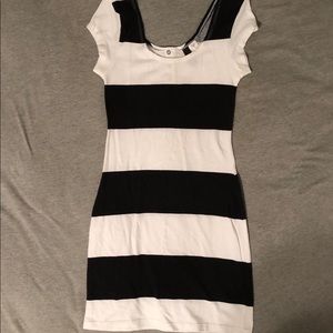 Black and white striped mini dress from H&M says size 2 but it’s definitely smaller, would fit best on a small or extra small . Can be worn as a short dress or a long shirt with leggings