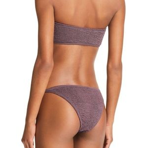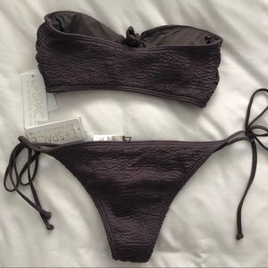 Matching strapless top and bottom. Bandeau top with duo of ties, all over smocking, pullover and soft removable padding. Side tie bottoms with all over smocking and medium coverage. Hand wash for both pieces - new with tags including liner in the bottoms.