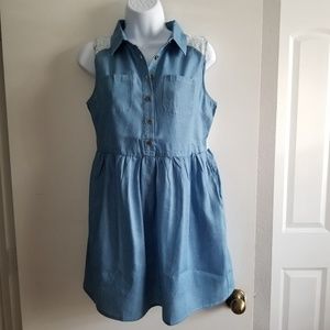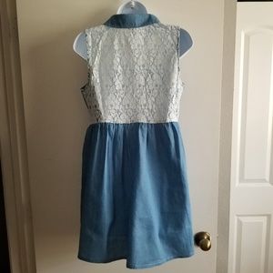 Brand NWOT Cute lightweight short denim like dress. Has 2 front pockets and 2 side pockets. Lace back floral design.