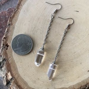 Crystal quartz dangly earrings . Stainless steel metal post & chains . ( Allergy free , nickel free , tarnish free , hypoallergenic ) wire wrap jewelry . Natural healing stones & crystals . Handmade by me π bohemian , boho chic , trendy , fashion , birthday , friend , gift , xmas, stylish . Genuine polish crystal quartz . Silver color Stainless steel metal . St valentine , dainty , anniversary , gems , yoga , celt , celtic , goth , gothic , gem , gems , gemstones , crystals , witch , fairy , mermaid , unicorn , handcrafted , wite wrap stones .