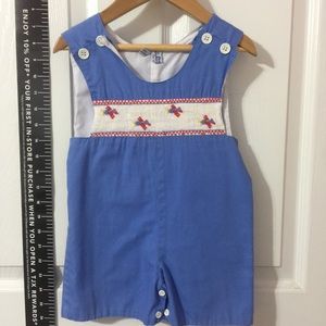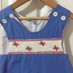 Boys romper with smocked airplane designs.