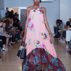 This beautiful dress is straight off on the runway. It looks the same Front and back, with long next tie that can be worn at front or at back. Peachy/salmon color. Boho chic