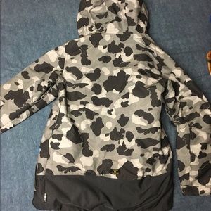 Insulated snowboarding jacket size small. Waterproof rated at 10k mm. Has phone pockets, RFID lift pass pocket, underarm vents, full hood, snow skirt. Size small, I’d recommend someone with 30-32 waist and 5’8-5’11