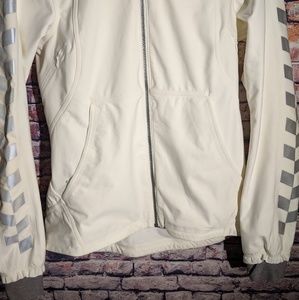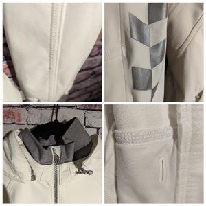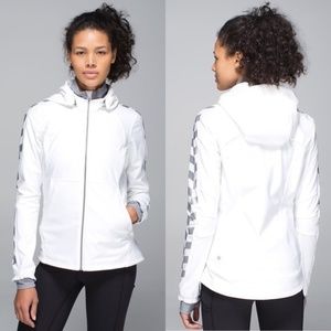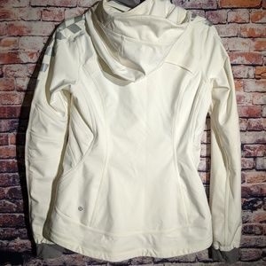 Lululemon Feelin Frosty Softshell Jacket in White. Size 6. Removable hood, zipper pockets, soft grey neck and sleeves with thumb holes. Reflective grey / silver details. Wind and water resistant. Cord management system. “Just because it's cold out doesn't mean training moves inside. We made this outer layer to be a versatile run jacket when the temperature plummets we layer it over a fleece jacket, when the weather warms up we pull it on over a tank & hit the road. Mother Nat