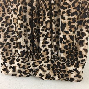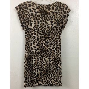 Features: animal print, v-neck, belted waist, fitted/stretchy bottom, gathered front top, short/cap sleeve. Don’t know if this is a dress or tunic could probably be worn as either. Very good condition. Size small. Approximate Measurements: chest 28” (armpit to armpit), length 28”, sleeves 5 1/2”. SKU CC1