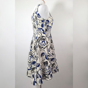 Lovely cream fit and flare dress with black and blue floral design. Black princess seaming detail front and back. Hidden side zipper. Bra strap clips on inner shoulders. Fully lined with pink lace at the bottom hem of the lining. Excellent like new condition. Bust 17 1/2", waist 14 1/2", and length is 37".