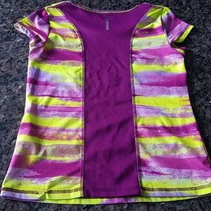 Reebok girls workout shirt. Quick dry fabric with a mesh stripe down the back (second picture.) Bright colors. Cap sleeves