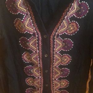 I love this & received so many compliments. The bold embroidered stitching makes such a statement on the black. Perfect with black leggings and boots for fall and winter.