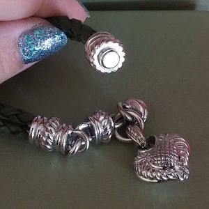 It has a non-removable 925 Sterling Silver "puffy heart" charm with a pretty green stone on one side & sterling silver pattern on the other