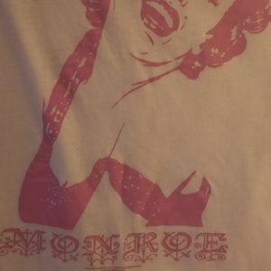 Vintage 80s Pink Monroe tee. Factory cut collar, sleeves and bottom. Very flash dance! Ends will roll because of style, this is not a flaw but by design, please see pictures. This is a pale pink tee with darker pink print with Marilyn Monroe's face and fancy font stating Monroe underneath. Excellent pre-owned condition with little sign of wash and wear.