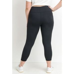 These full leggings have deep moto-style ribbed pockets, ribbed ankle accents, and mesh panels across the shins. The wide waist band offers abs support, making these leggings perfect for lounging or out and about.