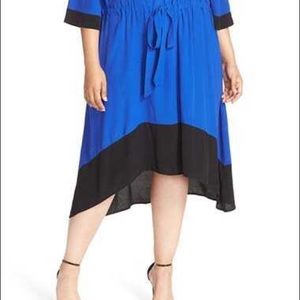 Style: Stylish contrast trim hi-low dress. Tie waist. Scoop neck with key-hole back button. Perfect addition to your work wardrobe! Machine washable!