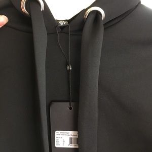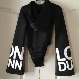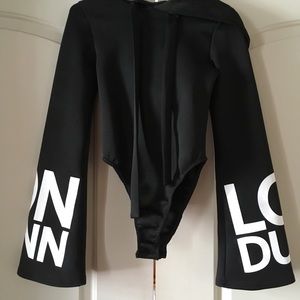 NWT SOLD OUT Londunn Missguided Collab with model Jourdan Dunn Hooded Bell sleeve bodysuit. Such a special find! It’s black with white lettering that says Londunn on both arms. This is THE COOLEST but not my size 😩😩😩😩 it’s polyester and elastane material - feels like thick high quality active wear. Snap closure. Cheeky bottom but not thong.