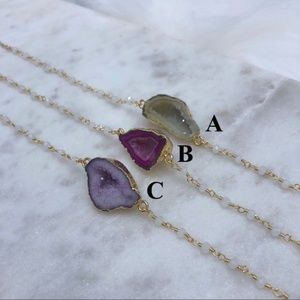 Choose ONE petite natural druzy stones with natural white chalcedony 22k gold plated rosary chain connected to solid chain 18k gold plated chain to total length approx. 16.5" with claw clasp closure. Size of druzy geode ranges from approximately 3/4" to 1" in length depending on your choice. Delicate and subtle. Handmade in Texas.