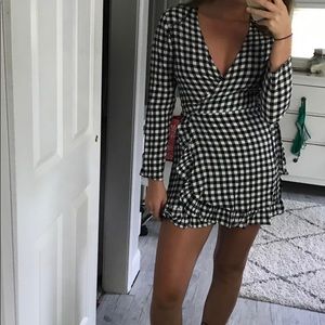 @beachblonde12 the model is wearing an aus 8 and i’m wearing an aus 12. I think it fits me more like a 6 than an 8. the only thing is it is short on me, i’m 5’10”. also it has the adjustable waist tie so it can be looser or tighter depending