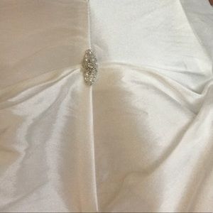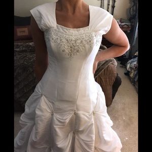 Gorgeous hues of blue and pink mingle beneath the white shimmer taffeta—“Diamond White.” Altered by an Alfred Angelo specialist, the same beading and taffeta were utilized to construct this modest wedding dress. Corset lace up back will accommodate a variety of sizes:4, 6 and 8. The smaller the size, the more dropwaisted it will be. I’m a true size 6 and I wished I had bought the 8 because the effect was more drop waisted when I tried the sample. But it was gorgeous on my wedding day regardless.