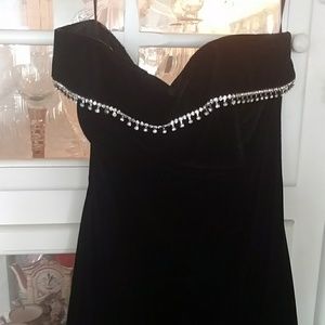 I really hate to part with this... beautiful black belt velvet/velour evening gown. Worn once to a Christmas party. It is strapless, pictures shown are straps to hang. Exquisite rhinetone detail. Very classy. There is one smudge on lower part of dress that I tried to photograph but is hard to show. I distinctly remember dropping some lotion I was applying to my arms and tried quickly to wipe off as I headed out the door. Not sure if it can be removed. I outgrew it and never tried.