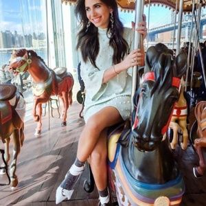 Gorgeous high neck studded dress. Missing one sole bead on the front as shown but is not noticeable, however this hasn't been work so it includes extra beads to be sewn on, I just never did! Super stretchy material, bust measures approximately 16.5 inches