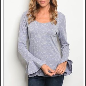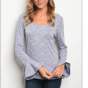 Scoop neck, long bell sleeves. Really pretty back detail. 60% cotton, 34% polyester & 6% spandex. Color is a bluish gray