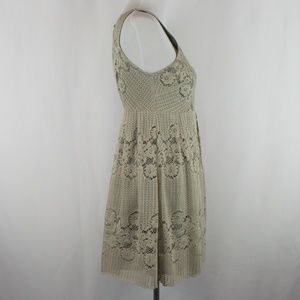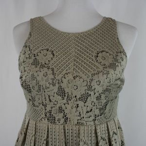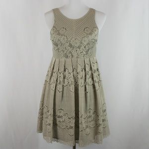 Sleeveless dress with a bit fit and flare. Pleated skirt with a scalloped hem. Lace overlay in Taupe over lining. Scoop neck with button at the back of neck. Back is open to waist line. Left side zip closure. Super cute and great for Fall!!