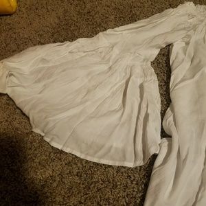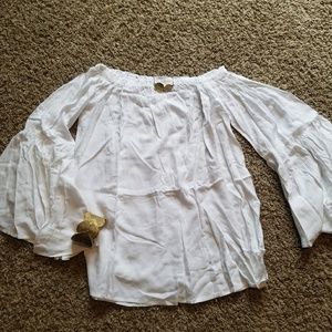 White Off the Shoulder Top. Flowy and beautiful! SUCH an awesome top. Styled with Lia Sophia necklace and bracelet.