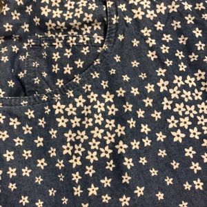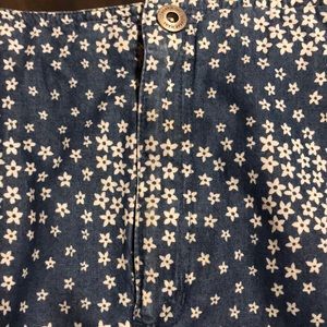 A-line maxi skirt: 31” long. No waistband, 34” around waist with 5” long metal zipper, 5/8” (dia) brass metal button & hidden clear button front closure. Hip measurement: 44” around. 9.5”Dx7.5”W right & left side pockets with curved 7” opening & 4”Wx3”D watch pocket in right side pocket (photo #3). 100% cotton blue denim with tiny 1/4” - 1/2” white star-shaped flowers creating a patchwork type pattern. Hem: 60” around @ hem. 100% cotton. In excellent condition, worn 3 times. Machine wash & dry.