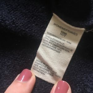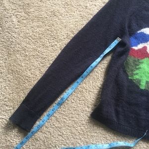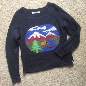 Gently loved navy crewneck sweater by Woolrich featuring a mountain camping scene perfect for fall and winter. In good used condition, no holes or snags, with some slight signs of rubbing at the armpit as pictured (the quality of that image is poor and makes the fabric look lighter in that area, which it isn't as seen by the other pictures).