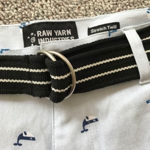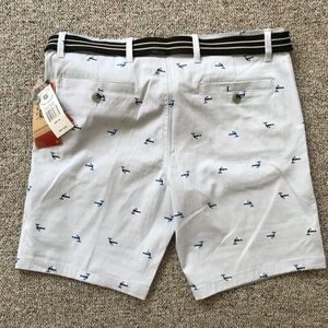 Brand New, with tag. Sizes 34 and 36 Available. Includes canvas Navy blue Belt with white stripes and extra buttons. Color is listed as Light Blue, retails for $62. 97% Cotton and 3% Elastane gives these shorts a super comfy stretch to them.