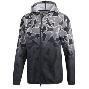 This windbreaker has an allover camouflage print with a monochromatic look that goes from light to dark.