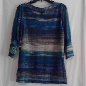 New with Tags. 100% Polyester. 3/4 Sleeves. Multi-Colored; Turquoise, Blue, Green, Gray, Off-White. Sheer Top.