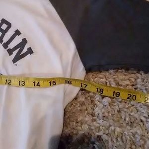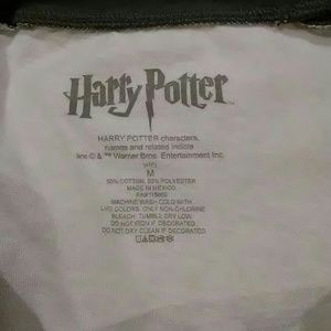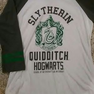 White shirt with gray 3/4 sleeves. Has Slytherin crest. Great to wear for Quidditch games! Purchased at Hot Topic.