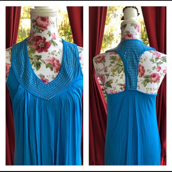 Summery, cool dress with lots of breezy flow. Sleeveless with a racer back style. Rhinestone accents at the collar. Goes great with sandals and belt for a day out and can also double as a bathing suit cover-up🏖Avail. in 3 colors🏝🏝Mannequin is wearing the Sky Blue.