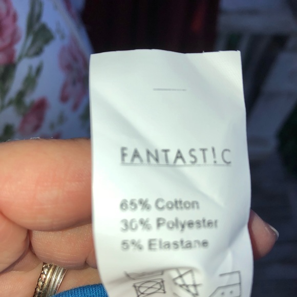Bust is appx 37 inches to 45 inches as fabric is very elastic. 65%Cotton/30%Polyester/5%Elastane. Smoke free/pet friendly home.