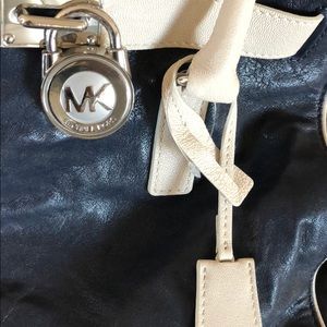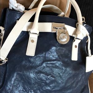 Large Hamilton navy Michael Kors Tote. Note that the leather looks weathered due to the texture and the way the light reflects it, but it’s brand new with tags! Navy blue exterior with off-white leather accents and a beige interior. Silver lock on front adds a bit of flair!