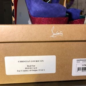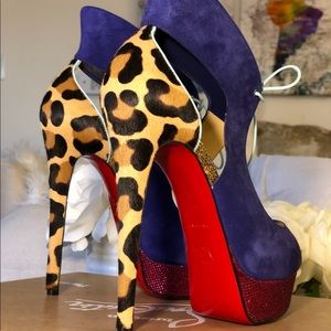 New, unworn, authentic, Multi-colored Christian Louboutin Campania. Suede and leopard printed calf-hair platform with intricate pink metallic patten leather trim. Seasonal and RARE style/coloring.