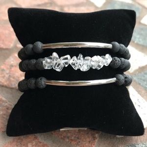 Bracelets set ( 3 ) Bead / beaded bracelet /lava rock /oil diffuser /oil diffusing bracelet /crystal quartz bracelet /gemstone bracelet / natural stones / boho /women gift /black beads /Stretchy/ All Fits 5.5 to 7 inch wrist ( If you need a different size lmk ) Handmade by me π .Genuine fine clear Crystal quartz chips on one bracelet . Genuine black lava rock (6mm) Turnish resistant silver plated bar spacers charms .I ship fast! Any questions lmk !π